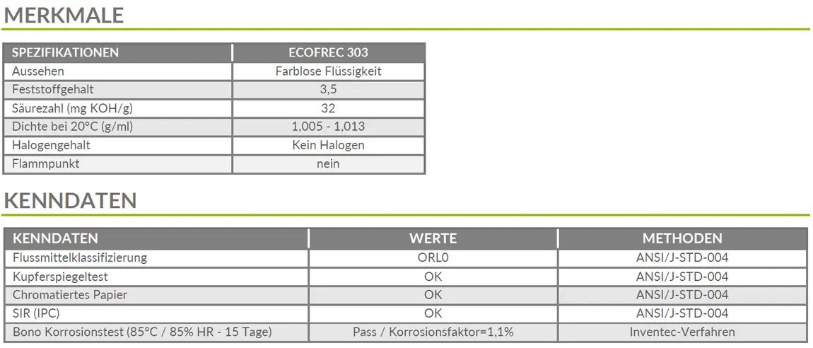 Ist ein rückstandsarmes, reinigungsfreies, VOC-freies (Volatile Organic Compound) Flussmittel. Angesichts der hohen SIR-Werte und des bestandenen BONO-Korrosionstests eignet es sich hervorragend für Anwendungen, die eine hohe Zuverlässigkeit erfordern. Es ist ein Flussmittel, das für das Wellenlöten von Durchsteck-, Mischtechnik- und SMT-Baugruppen entwickelt wurde. Eine Reinigung der Leiterplatte nach dem Löten ist aufgrund des sehr geringen Feststoffgehalts nicht erforderlich.