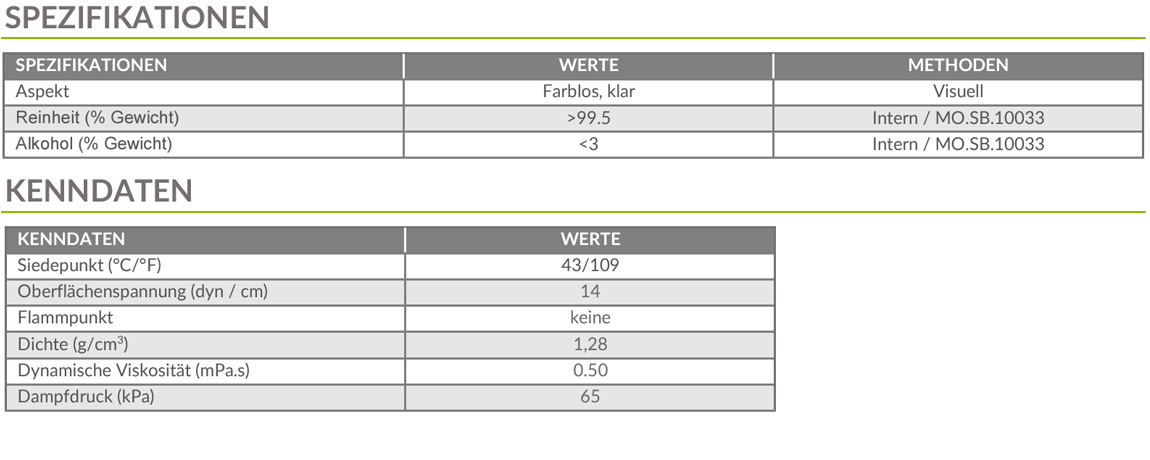 - Der relativ hohe Siedepunkt verringert das Risiko der Verschleppung von Lösungsmitteln und begrenzt somit den Verbrauch