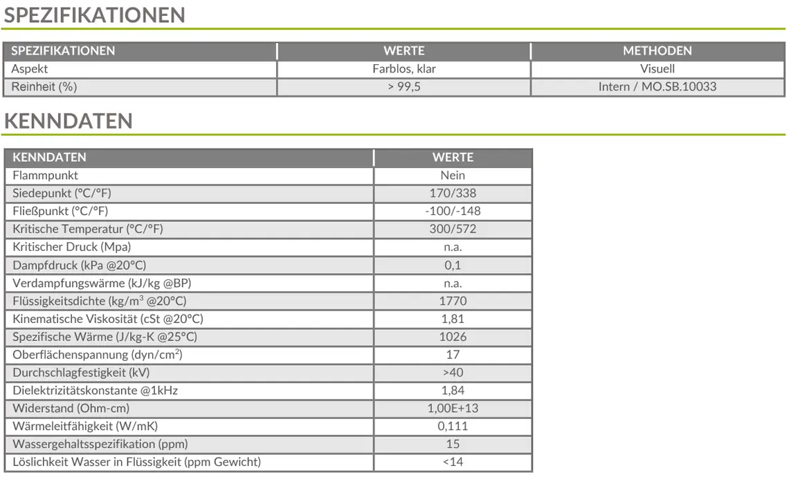 Ist eine dielektrische Wärmeübertragungsflüssigkeit, die speziell für 1-phasige Immersions- oder Direktkühlsysteme entwickelt wurde. Ihre hohe elektrische Isolationsfähigkeit ermöglicht das Eintauchen von Elektronik- und Elektrogeräten unter Spannung in die Flüssigkeit. Die vorteilhaften Eigenschaften der Viskosität, Dichte und Oberflächenspannung des Produkts sorgen für optimalen Oberflächenkontakt, was zu einer überlegenen Wärmeübertragungsleistung beiträgt.