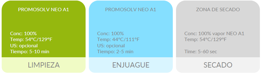 PROMOSOLV NEO A1 es compatible con todos los metales y aleaciones, incluidos los muy sensibles. También tiene buena compatibilidad con la mayoría de los plásticos y elastómeros, aunque debe hacerse una prueba antes de usarlo.