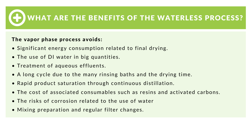 - The drying takes place in the vapor phase and continues in the cold zone for a quick and optimal finish.