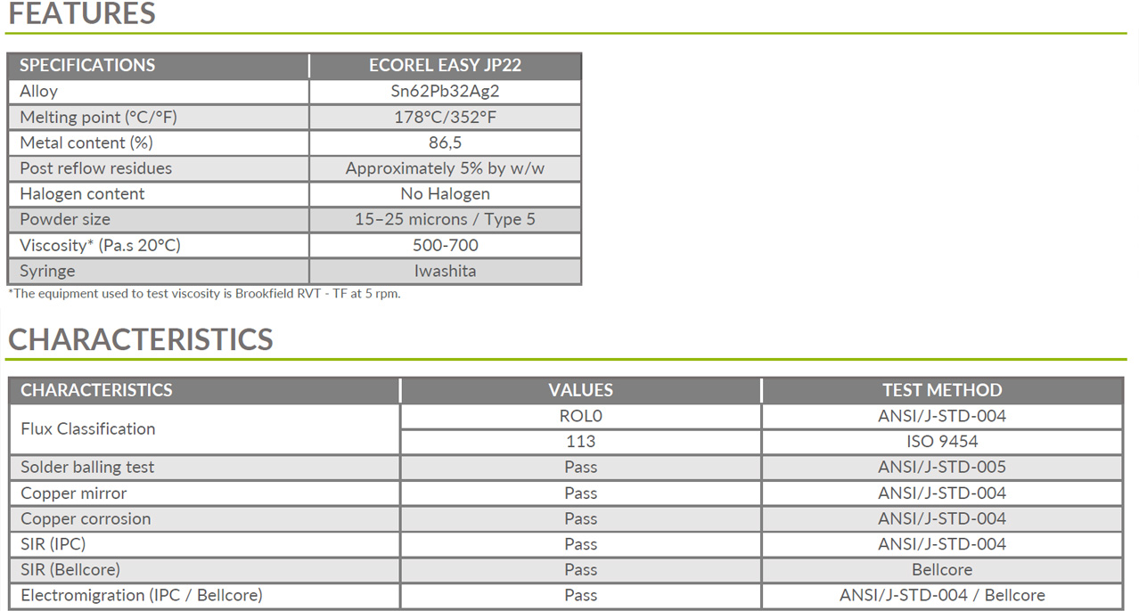 Is especially designed to work on jet printing equipment and to guarantee continuous and consistent deposits of solder paste. Although the flux is chemical inert, it is easy to clean with water or solvent based processes.