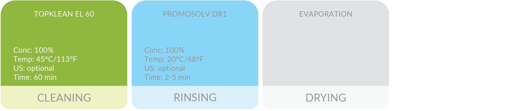 It is specially designed to use as a cold cleaner in a simple immersion tank and to offer a safe alternative for highly flammable products like IPA. For difficult to remove contaminants, the product can be heated to a maximum of 54 °C/129°F.