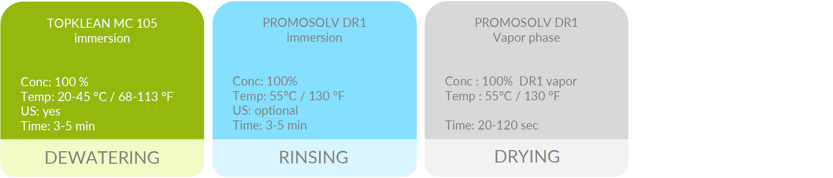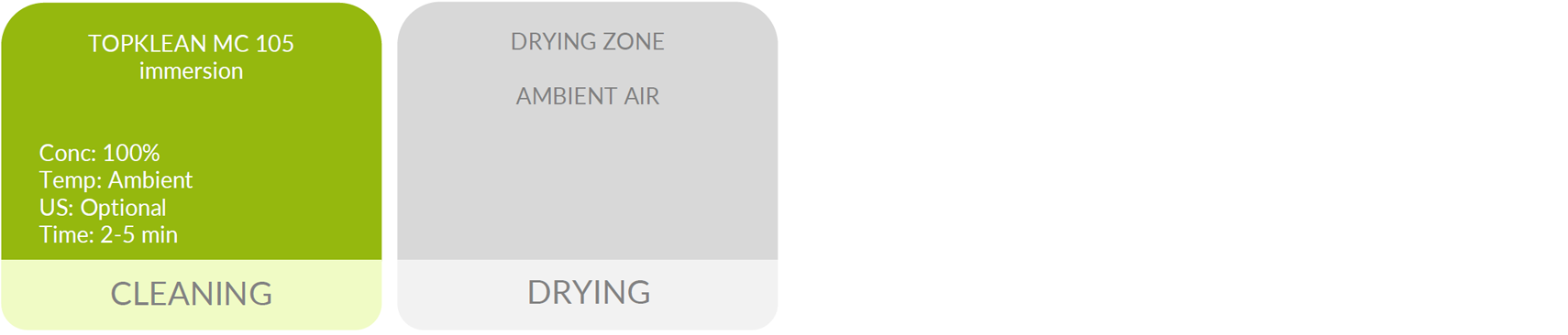 Is carefully designed to remove water fast and from difficult to reach spaces from cleaned parts after aqueous rinsing & before drying by solvent. In a solvent drying process, the water is displaced by TOPKLEAN MC 105 and rises quickly to the top of the tank where it is skimmed away. It can also be used as a simple dewatering before draining without the use of a drying solvent to eliminate risk of corrosion in between metal processing steps. It is compatible with all metals and most plastics used in the industry.